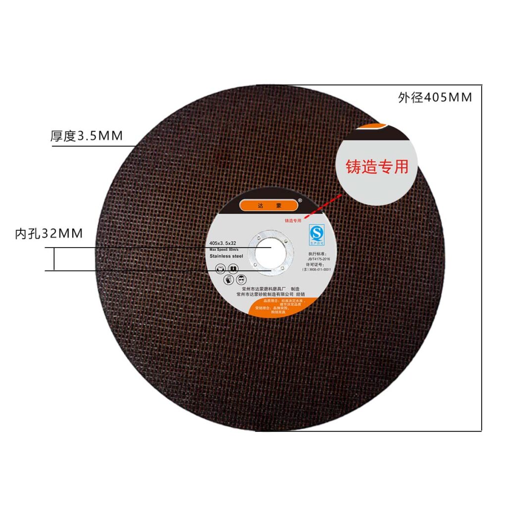 达蒙砂轮主要是生产树脂切割片的,最近为了迎国庆,技术部研发出了一款新品—405精密铸造片,常规尺寸是405*3.5*32mm。线速度在80m/s左右。今天达蒙砂轮小编带大家了解下这款新品。